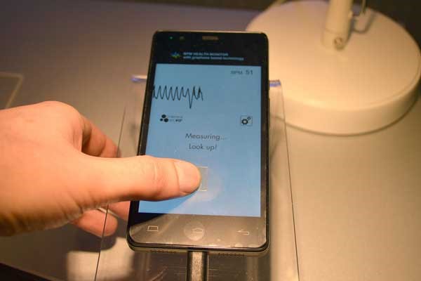 اپليکيشن موبایل سنجش ضربان قلب از طريق انگشت دست بدین صورت است که هنگامي که انگشت دست روي آشکارساز نوري ( ساخته شده با استفاده از گرافن و نقاط کوانتومي) قرار ميگيرد، انگشت به عنوان يک مدولاتور يا مدل ساز نوري عمل نموده و همزمان با پمپاژ قلب و خون رساني به نوک انگشت دست، نور دريافتي توسط آشکارساز دچار تغيير ميشود. با ثبت مداوم تغييرات، آشکارساز ميتواند الگوي تپش قلب را تشخيص دهد و شرايط ضربان قلب را روي صفحهي نمايش موبايل نشان دهد.