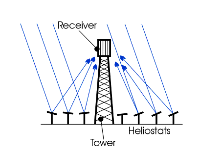 این نیروگاهها یکی از انواع نیروگاههای خورشیدی هستند که در ان سیستم شامل مجموعه ای از آینه هایی است (هلیوستات) که هر یک بطور جداگانه انرژی خورشید را متمرکز و به برج دریافت کننده مرکزی منتقل می کنند. انرژی توسط یک مبدل حرارتی که در روی یک برج نصب شده است و گیرنده نامیده می شود جذب میشود. در آن جا آب به بخار سوپر هیت تبدیل شده و این بخار توربین ژنراتور را که در پائین برج نصب شده به حرکت در آورده و تولید برق می نماید.